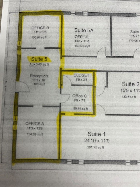 Unit 1 – Suite 5 – 3 offices, 1 reception area and 1 closet. $1200 rent. Utilities are included except for internet. Bathrooms are in the common area of the building.